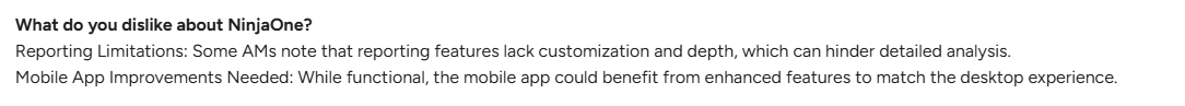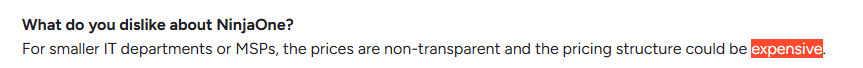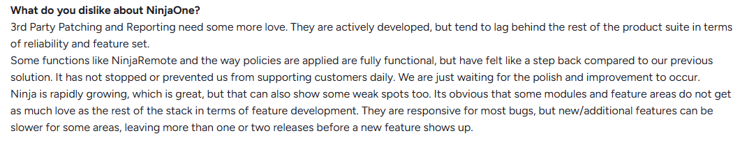 - Higher Cost Than Many Alternatives: NinjaOne users note that the per-endpoint pricing is more expensive than other patch management alternatives, especially for small setups or growing teams.