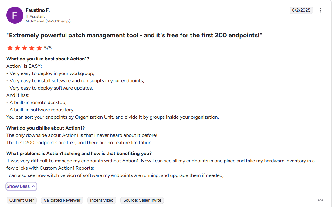 Action1 is infinitely scalable, and you can go from hundreds to hundreds of thousands of endpoints at a gradually lowering per-endpoint cost. On top of that, the software is free for your first 200 endpoints, fully featured, forever. This allows small businesses to use it for free as long as they want, while large enterprises can thoroughly test it before purchasing.