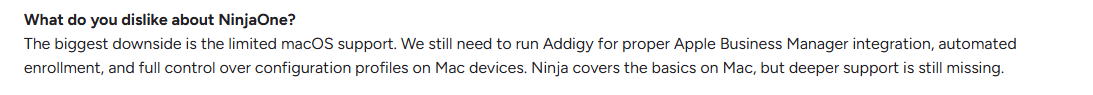 - Limited macOS and Third-Party Support: Although NinjaOne offers cross-platform support, users report limitations with macOS and third-party application support.