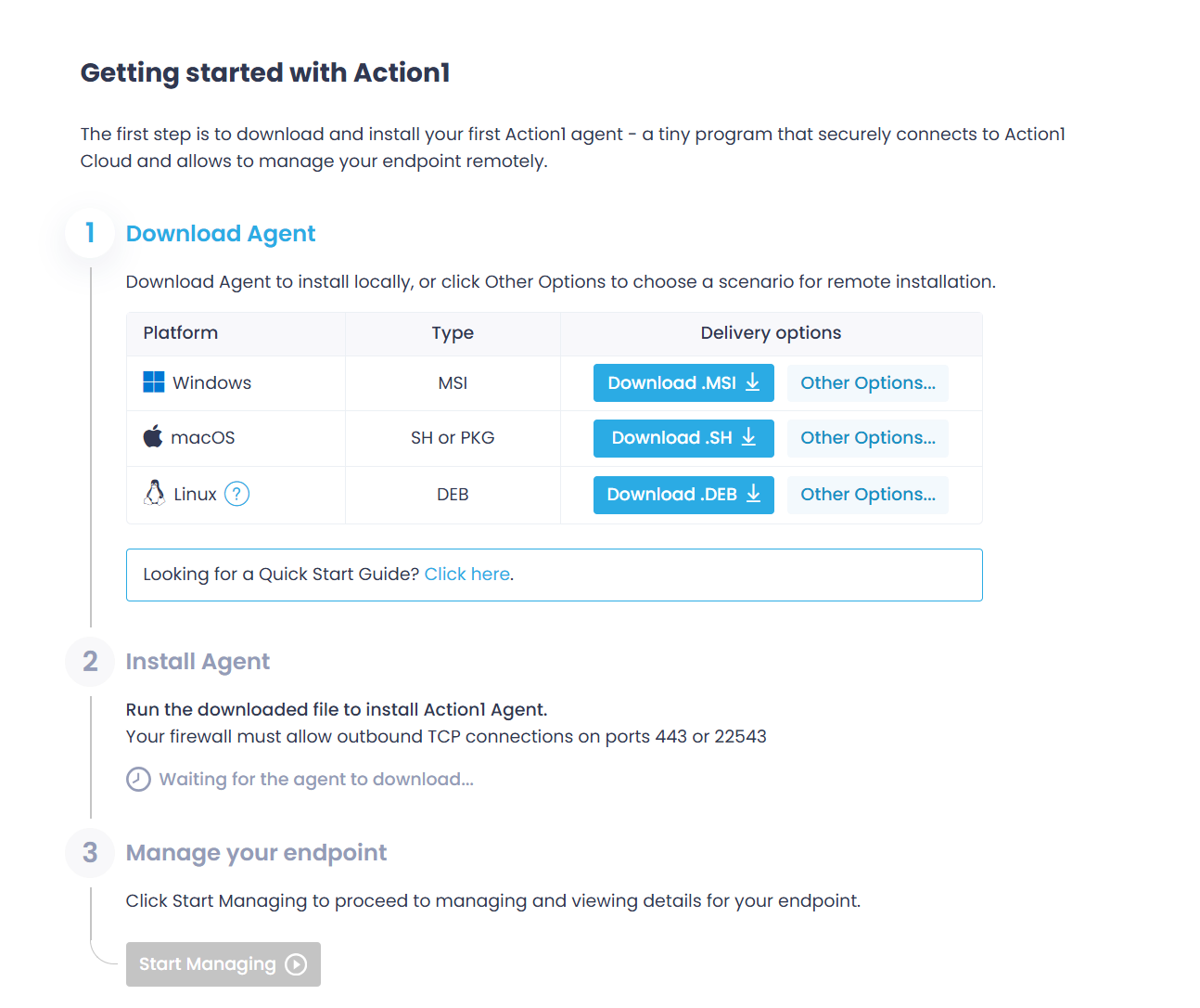 Note! For installation on remote machines, you have to do the following: In the “Getting started” wizard, click “Other options”. Then use the first option and copy the script, then you just have to run it on your target endpoints as root. This will automatically start the Action1 agent installation.