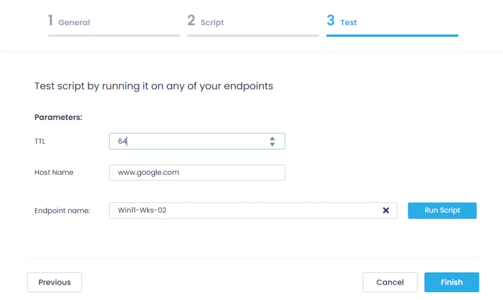 - Finally, on the Test step, select the target endpoint where the script will be executed, and click Run Script. After completing the test run, click Finish.