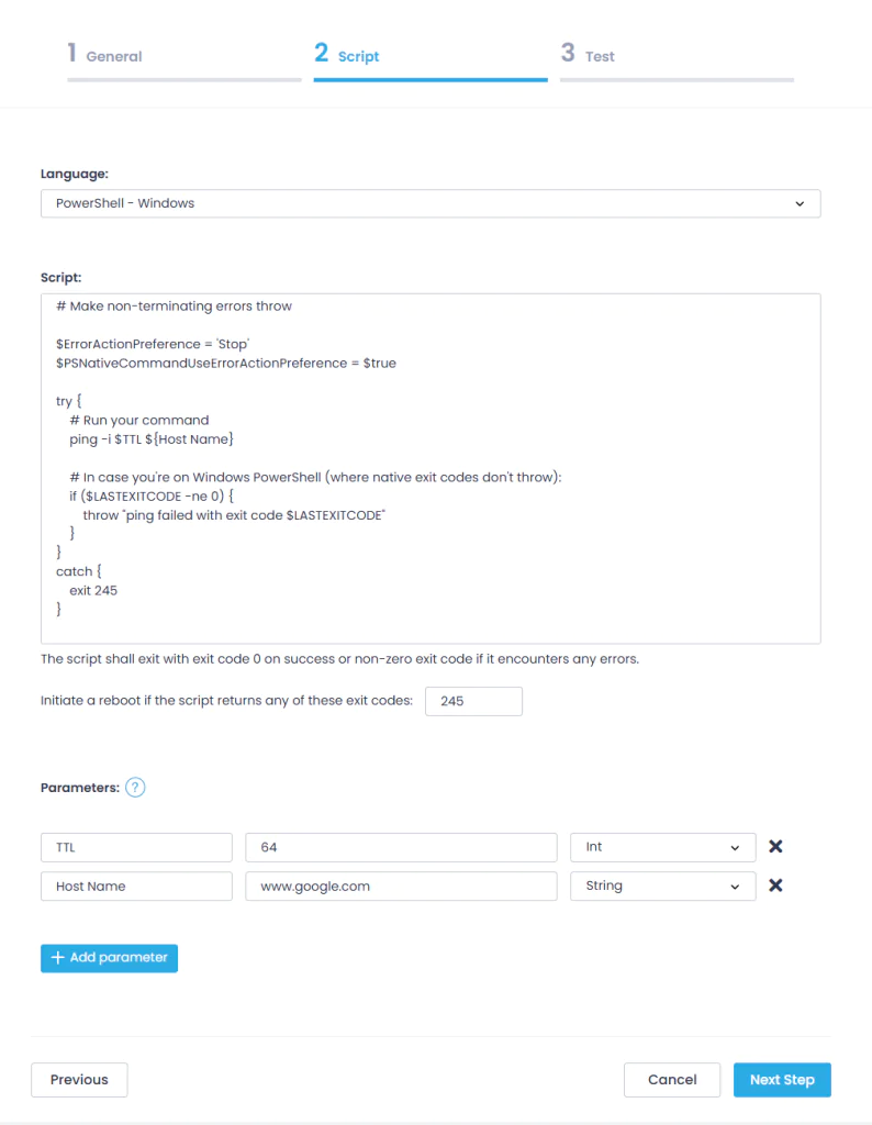 - If you want to initiate a reboot if the script fails, enter the exit code other than 0, e.g., 245.