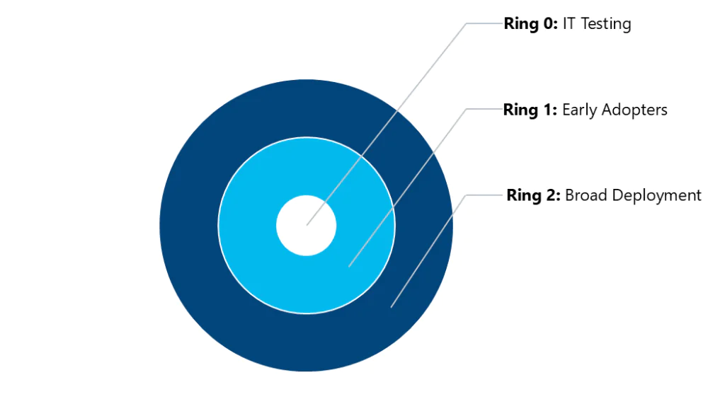 - Ring 1: Early Adopters – Small group from IT and business teams providing feedback (~20%).